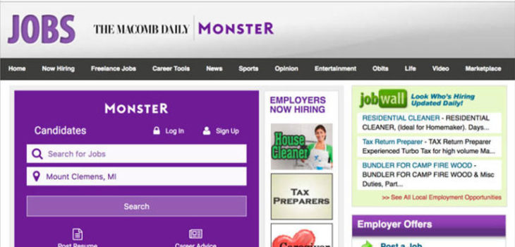 Provided material: Search tool (Monster), partner logo (Monster), newspaper logo, Job posting widget (AfterCollege), Resume building widget (MonsterMatch), stock art icons, employment tile artwork.