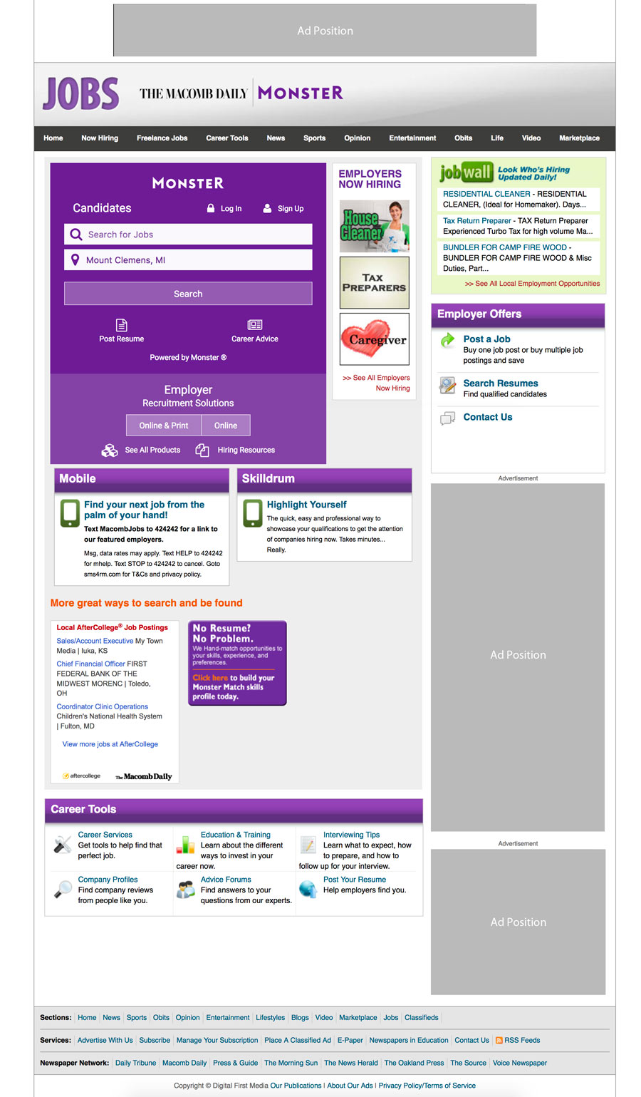 Provided material: Search tool (Monster), partner logo (Monster), newspaper logo, Job posting widget (AfterCollege), Resume building widget (MonsterMatch), stock art icons, employment tile artwork.